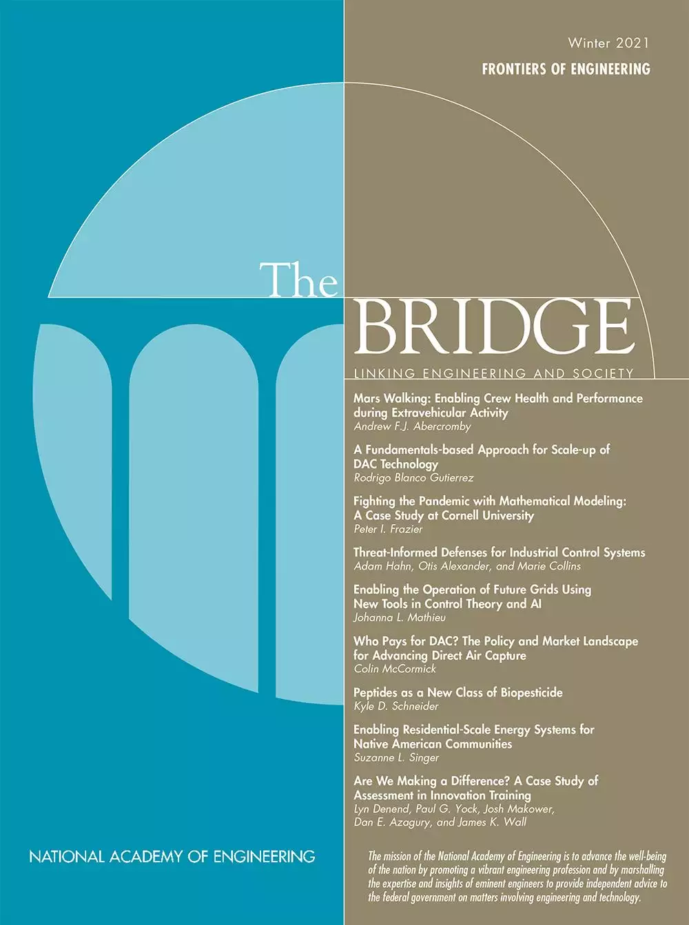 Download PDF Winter Issue of The Bridge on Frontiers of Engineering December 25, 2021 Volume 51 Issue 4 The NAE’s Frontiers of Engineering symposium series forged ahead despite the challenges of the pandemic, with virtual and hybrid events in 2021. This issue features selected papers from early-career engineers reporting on new developments in a variety of areas. A Fundamentals-based Approach for Scale-up of DAC Technology Tuesday, January 4, 2022 Author: Rodrigo Blanco Gutierrez Unique scale-up approaches are needed to accelerate the development of cost-effective DAC technologies. Energy touches, directly or indirectly, every aspect of daily life. As the global population increases, so does the demand for energy. The challenge is to provide affordable, reliable, and clean energy to support sustainable development (ExxonMobil 2019). Background To minimize the environmental and associated social and financial impacts of climate change, the Intergovernmental Panel on Climate Change set a goal to limit the rise in global average temperature to less than 1.5°C above preindustrial levels (IPCC 2014). Meeting this goal will likely require a combination of reduced greenhouse gas emissions from point source streams and removal of CO2 from the atmosphere. Direct air capture (DAC) technology may help with the latter, similar to natural sinks, but at much higher productivity (Sinha and Realff 2019). Technical challenges for DAC include efficient capture of CO2 at low concentrations and minimization of its energy consumption. In addition, large-scale deployment is required to capture up to 10 billion tons of CO2 per year (NASEM 2019). The large scale needed and the sense of urgency to address current climate issues necessitates unique scale-up approaches to accelerate the development of cost-effective technologies. The development strategy presented in this paper relies on an understanding of process fundamentals coupled with detailed modeling, parallel work across different scale-up activities, and collaborations. Scale-up Considerations Technology scale-up is a multidisciplinary activity involving science and engineering across different scales (see figure 1). At one end of the scale, active materials define process characteristics that have an impact at the other end of the scale, such as plant size, mechanical and civil considerations, and potential for process integration. FIGURE 1 Multiscale nature of technology scale-up. To accelerate technology development, activities across different areas need to be efficiently progressed in parallel, through identification of relevant tie points across scales. For instance, the contactor geometry will have implications for larger-scale aspects such as equipment selection (to accommodate pressure drop or to provide the energy required), structural needs, and their associated implications for cost and lifecycle assessment. The wide range of scale-up activities requires expertise across several science and engineering disciplines, such as material synthesis and characterization, and chemical, mechanical, and civil engineering. And collaborations are needed among universities, national labs, startups, and industry to accelerate scale-up and deployment. ExxonMobil has entered a joint development agreement with Global Thermostat to advance technology that will capture and concentrate CO2 from air. Global Thermostat brings more than 10 years’ experience in the DAC space with a focus on materials and demonstration units, while ExxonMobil brings expertise in process and materials scale-up, phenomenological modeling, process development, and project execution. Use of a Model-centric Scale-up Method The nature of DAC involves a number of challenges across different scales. They are being addressed using a model-based method that focuses on understanding the fundamentals that drive these processes in order to identify optimal scalable solutions and potential R&D opportunities. Process fundamentals are targeted by decoupling integrated phenomena into simpler elements that can be characterized and validated through small-scale experiments (see figure 2). This strategy improves understanding of fundamentals and increases confidence in model results when validated phenomena are integrated in larger-scale experiments and systems. FIGURE 2 Model-based scale-up approach decouples integrated phenomena, targeting model validation through simpler experiments. Active Materials Another fundamental area of focus is the performance of active materials. DAC process performance using solid sorbent materials depends on the properties of active materials for capture and regeneration. During the capture step, air flows over/through the material loading it with CO2. Once the material reaches a certain capacity, the CO2 is desorbed, through heat and/or vacuum, to be further processed, leaving the material ready to restart the capture-regenerate cycle. The main R&D objective is to maximize the working capacity of the active material, minimize the energy expended in regeneration through appropriate materials selection, and minimize energy requirements due to pressure drop to move large amounts of air by using an appropriate form factor for the process module and heat integration either between modules or with process facilities. Two challenges for active materials in DAC technology are (1) the low concentration of CO2 in air, which requires the use of materials that can selectively and efficiently capture CO2 from dilute conditions, and (2) material regeneration at low temperatures. Amine-based sorbents are appropriate materials for this separation because of their CO2 affinity at low concentrations and low regeneration temperature. Understanding of their fundamentals, such as isotherms and heat of adsorption, and the associated modeling are both critical to establish the maximum potential capacity for capture and the required regeneration conditions. Other Performance Factors While t
